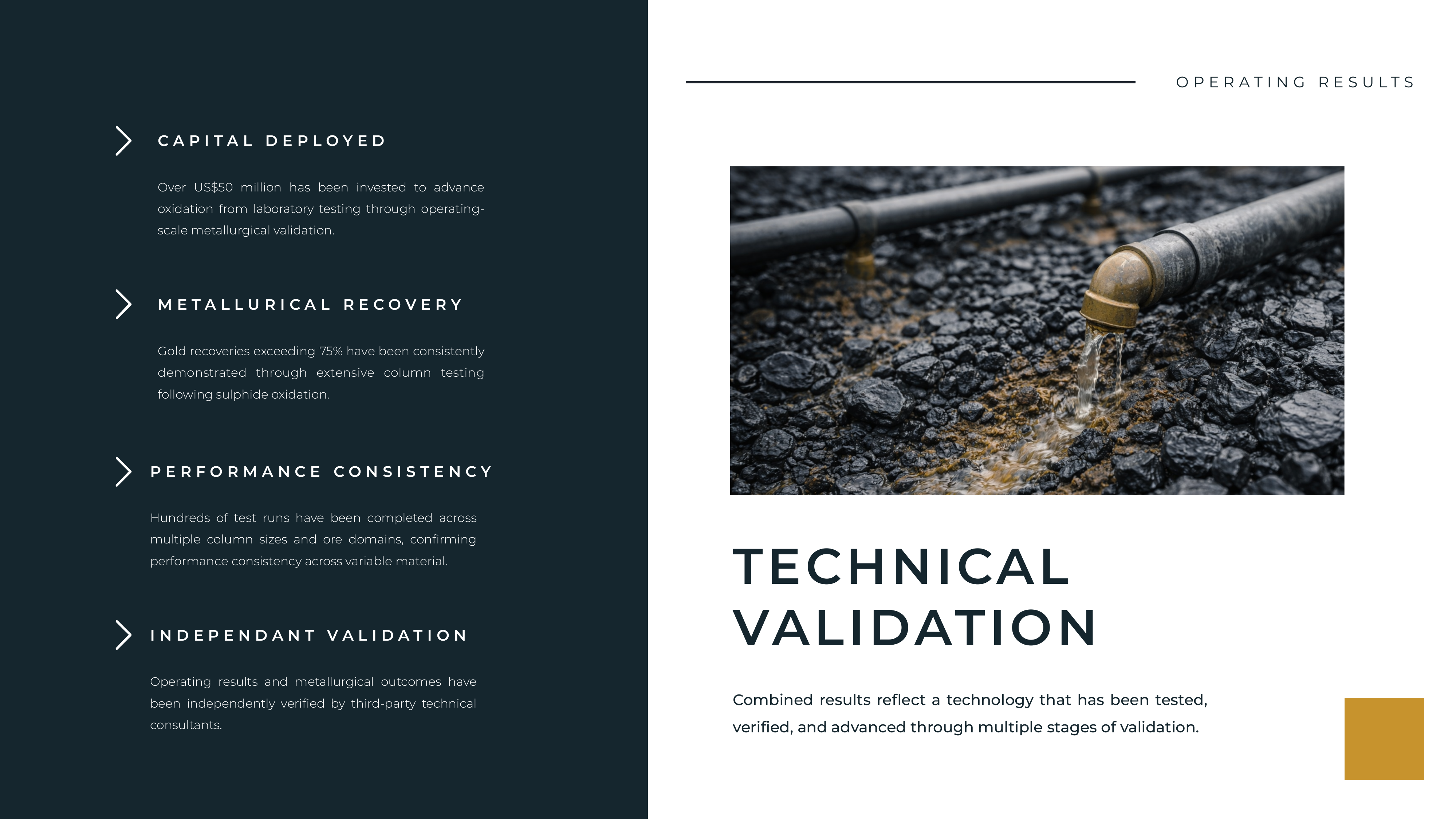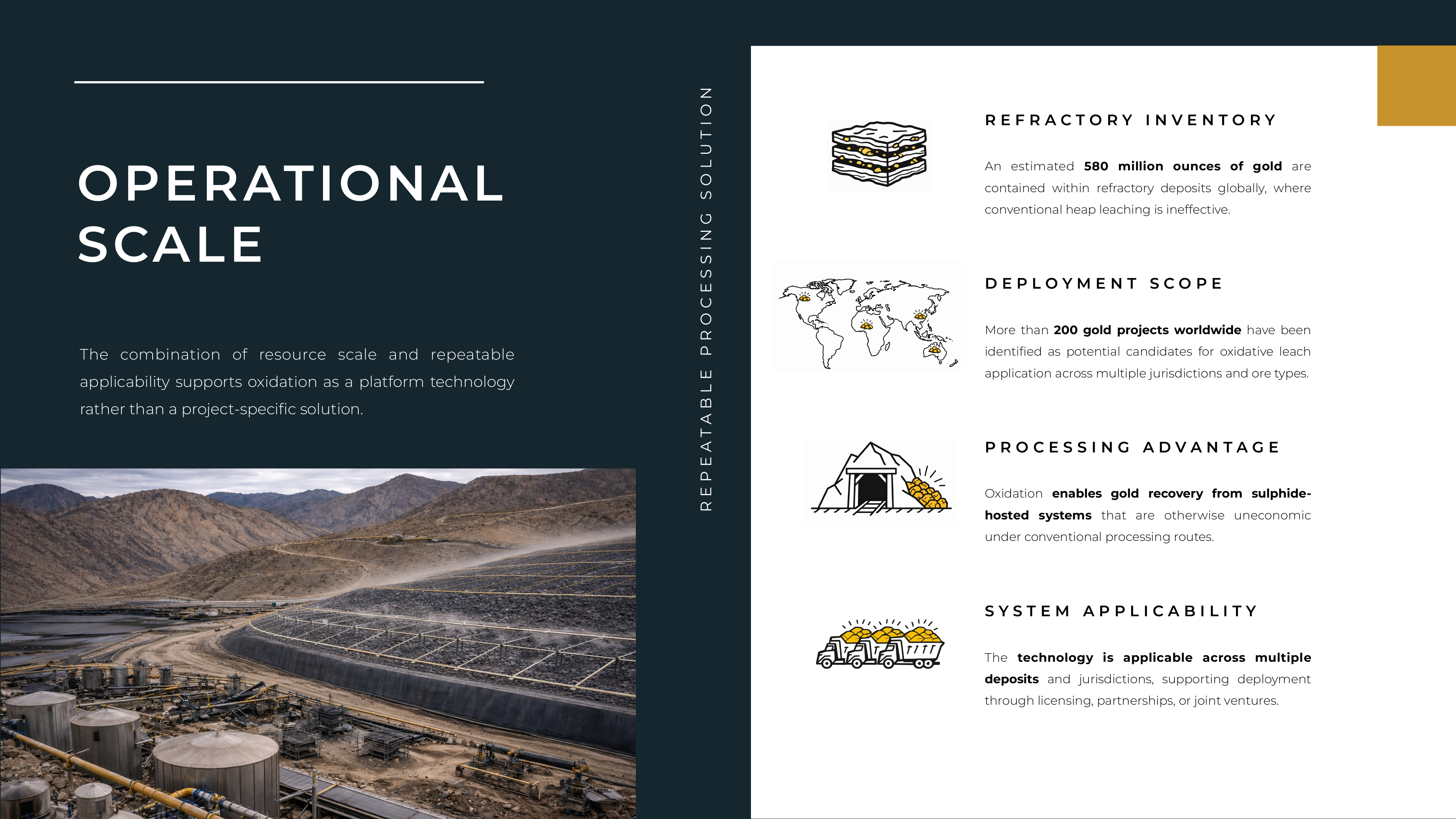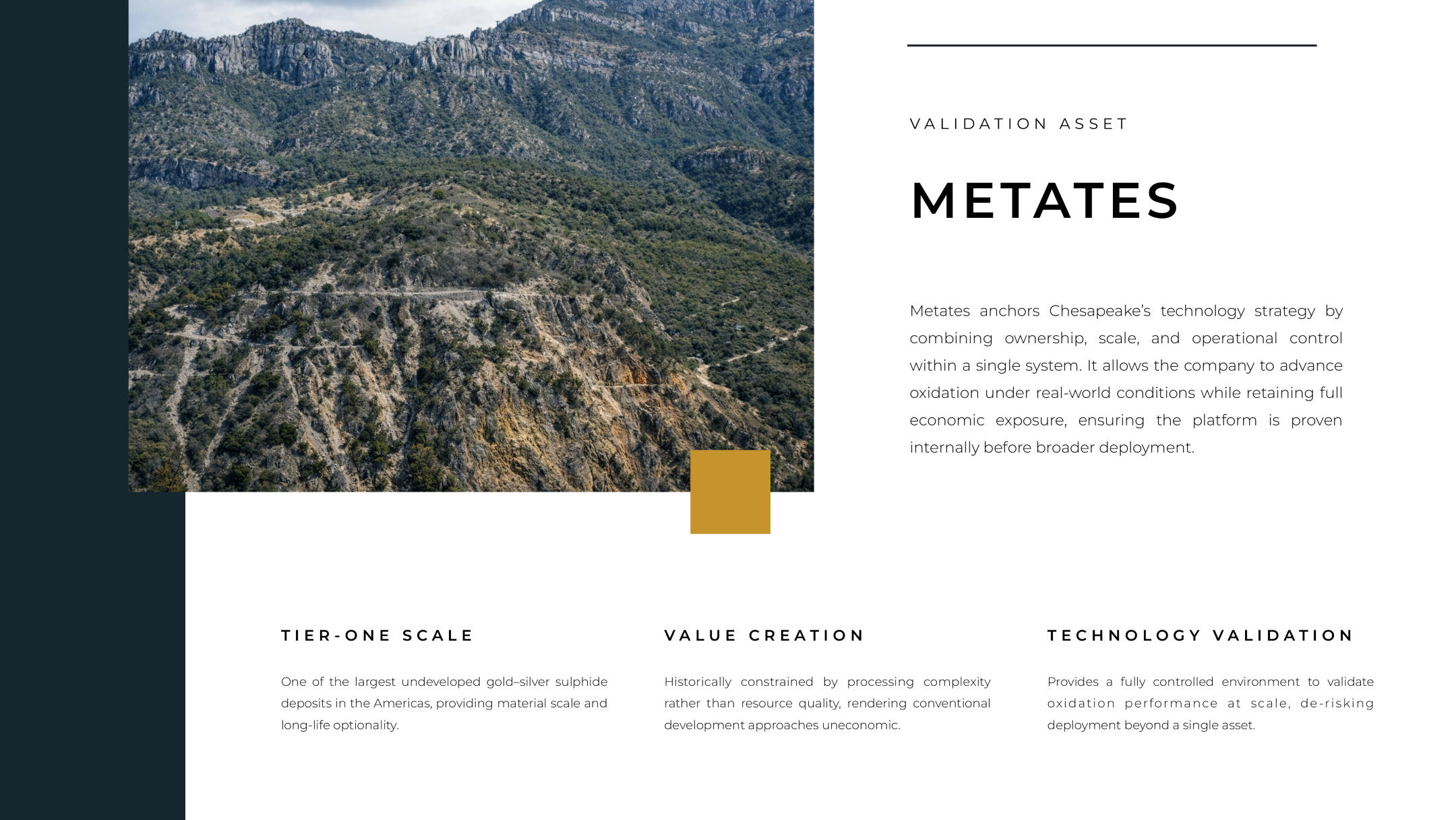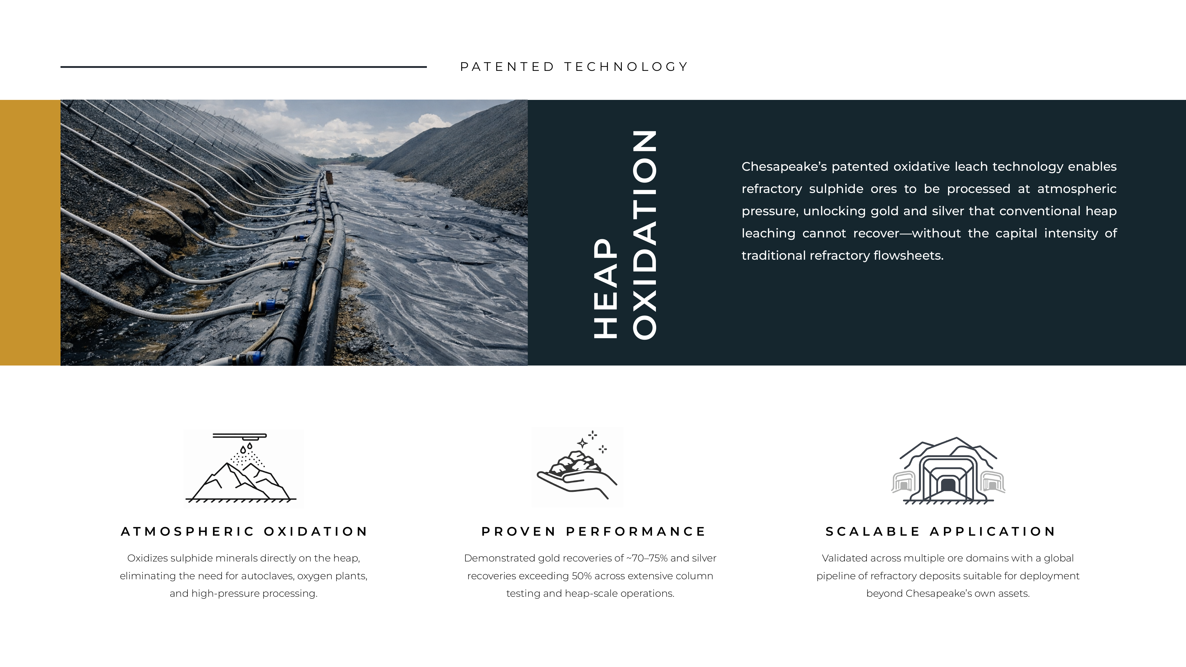 A significant portion of the world’s gold and silver resources remain constrained by refractory sulphide mineralization, where conventional processing methods are inefficient or uneconomic. Chesapeake operates within this challenge, applying oxidation-based technology to expand the universe of recoverable metal.