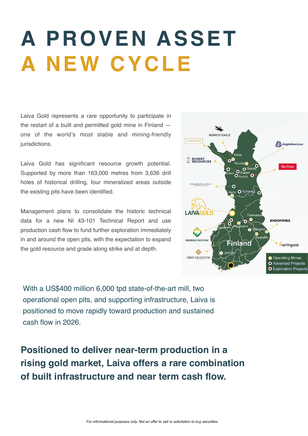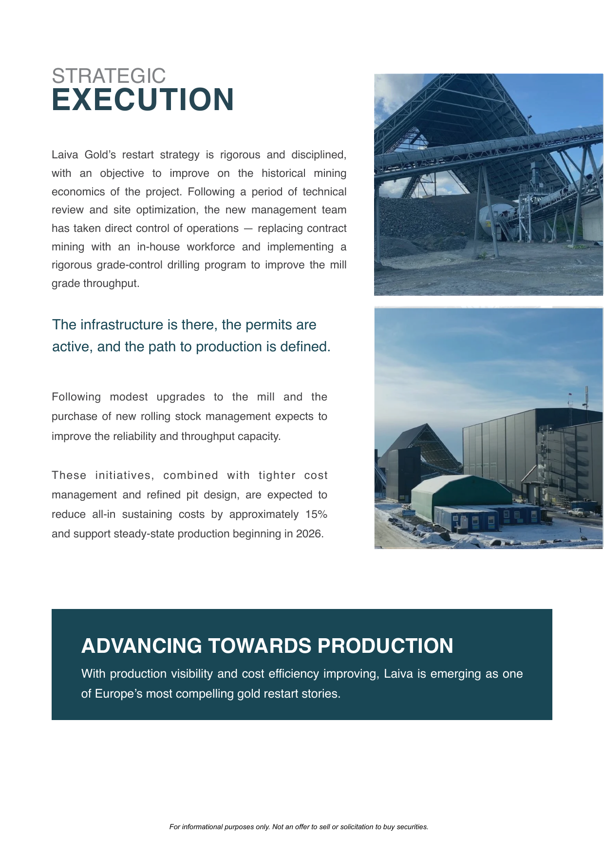 We positioned Laiva Gold as a restart story grounded in readiness — emphasizing permitting, built facilities, and jurisdictional stability to frame the opportunity around execution and timing rather than exploration risk.
